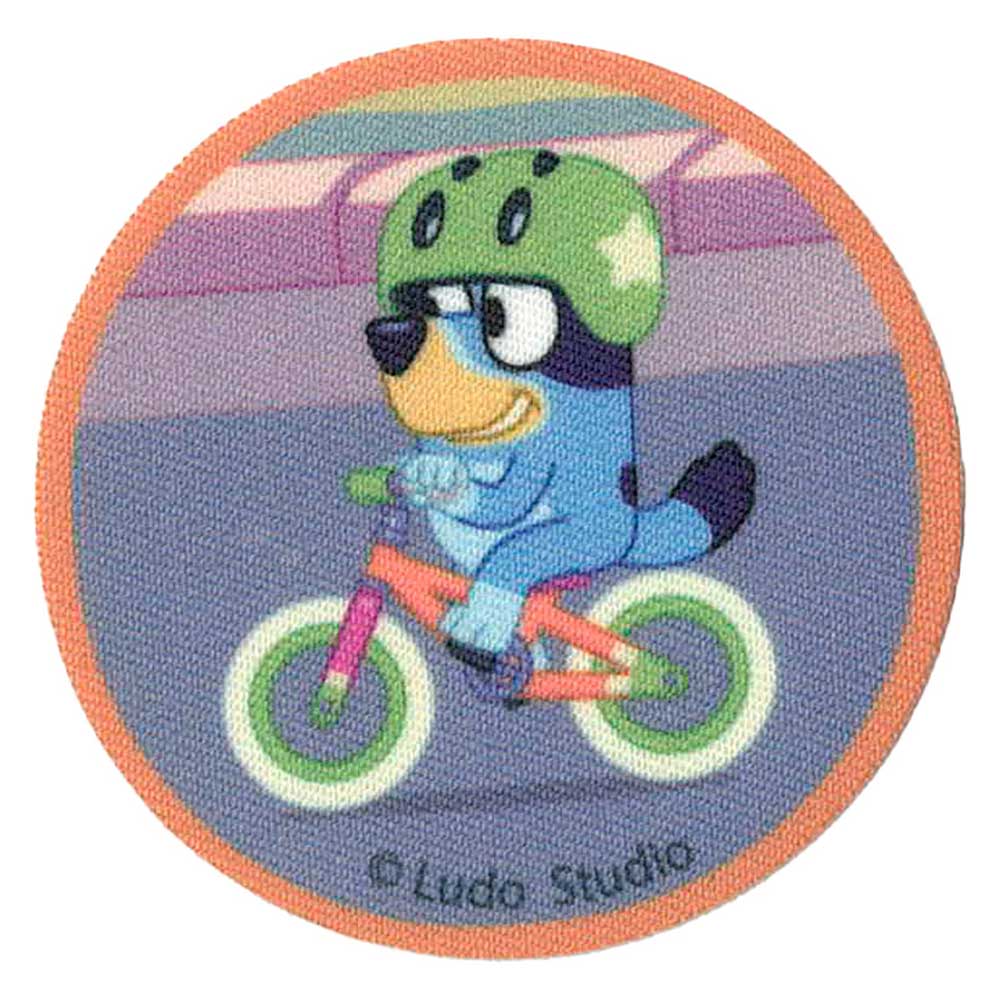 Parches Ropa Bluey – Parche Impreso Ropa – Animales – (licencia oficial) – Perrita Bluey en Bicicleta – Mascota – Perro Pastor Granadero Australiano – Blue Heeler – Deportes – Bike – Ciclismo – 6,5 x 6,5 cm. – Moda The Happy Patch