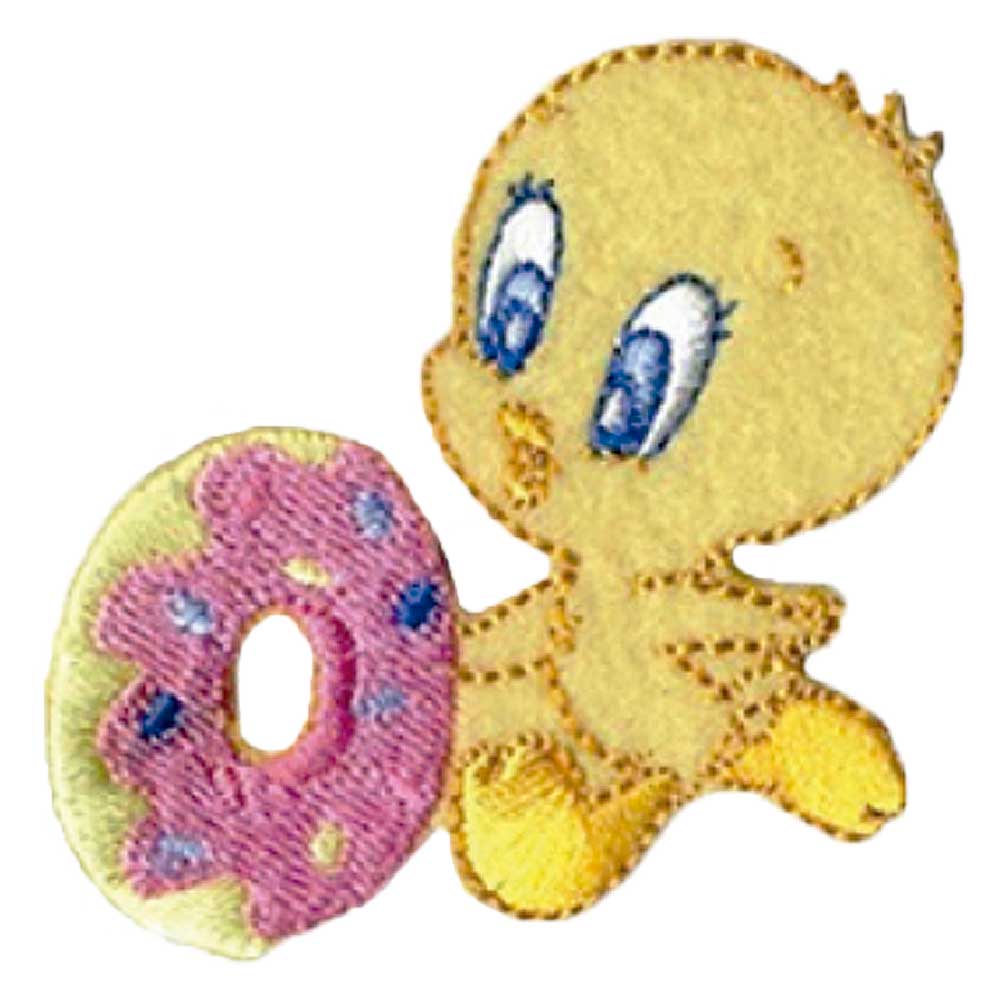 Parches Ropa Warner Bros – Parche Bordado Ropa – Animales – (licencia oficial) – Baby Looney Tunes – Tweety – Canario Piolín – Bebé – Tiernos – Adorable – Cute – Donut – Dona – 5,0 x 4,2 cm. – Moda The Happy Patch